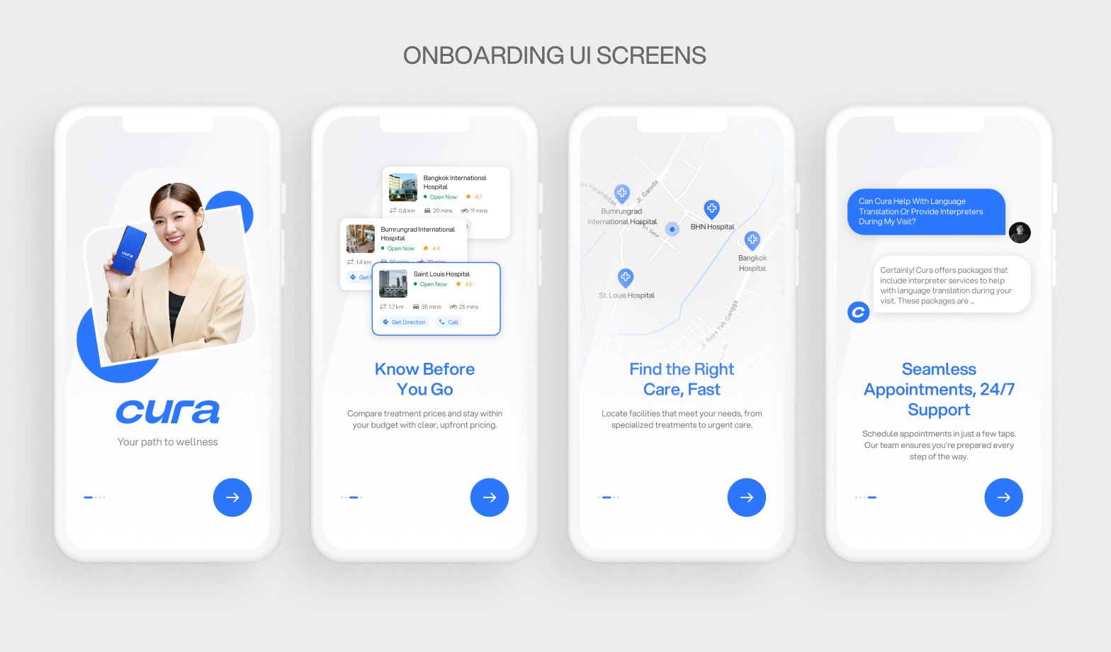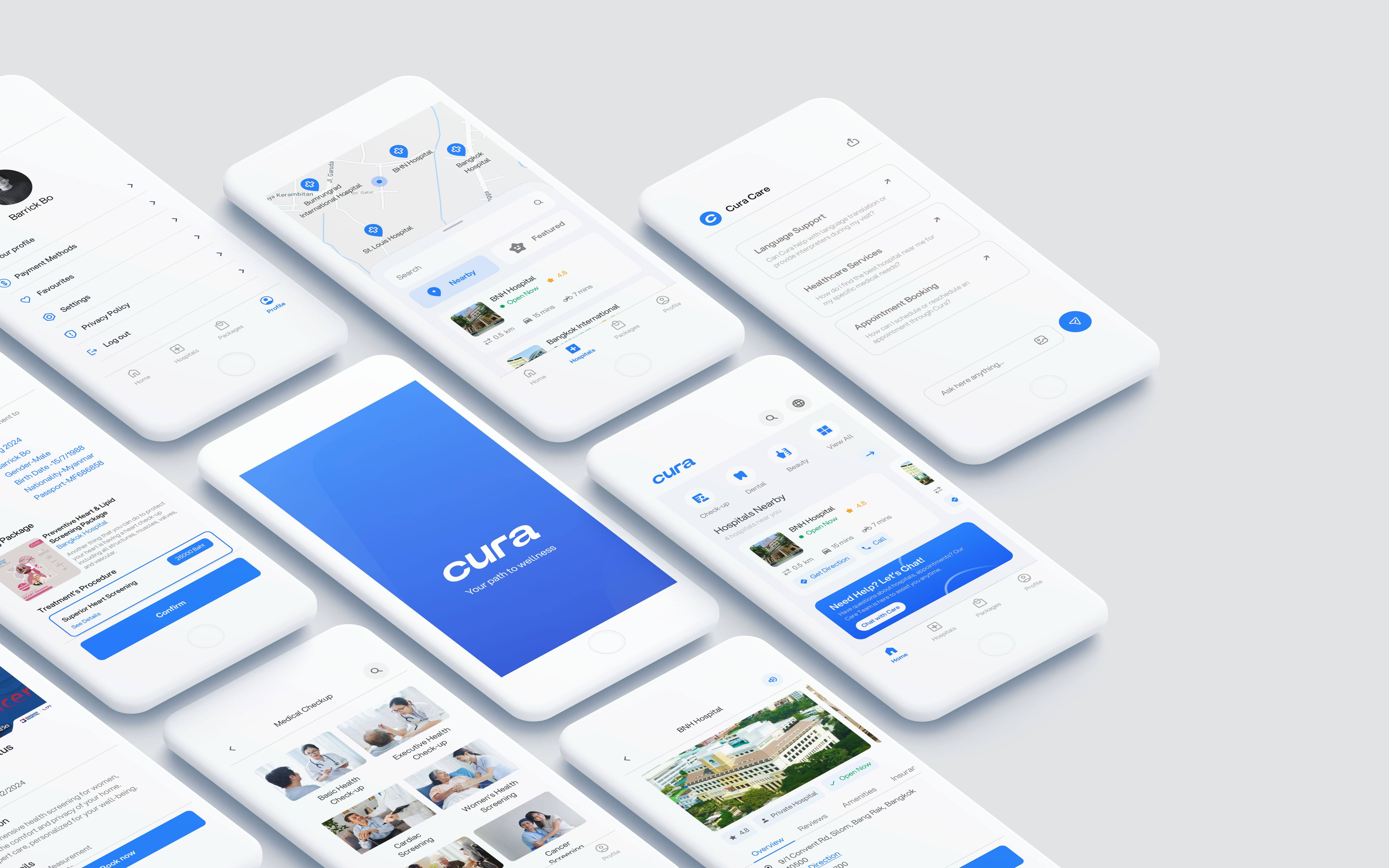 Navigating healthcare as an international patient can be overwhelming, especially when language barriers, unclear information, and inefficient systems come into play. This was the challenge faced by many travelers seeking medical care in Thailand. Cura Medical App was created to simplify the healthcare journey for these international patients. By providing a seamless platform for appointment scheduling, multi-language support, hospital navigation, and insurance integration, Cura bridges the gap between international patients and Thai healthcare providers.