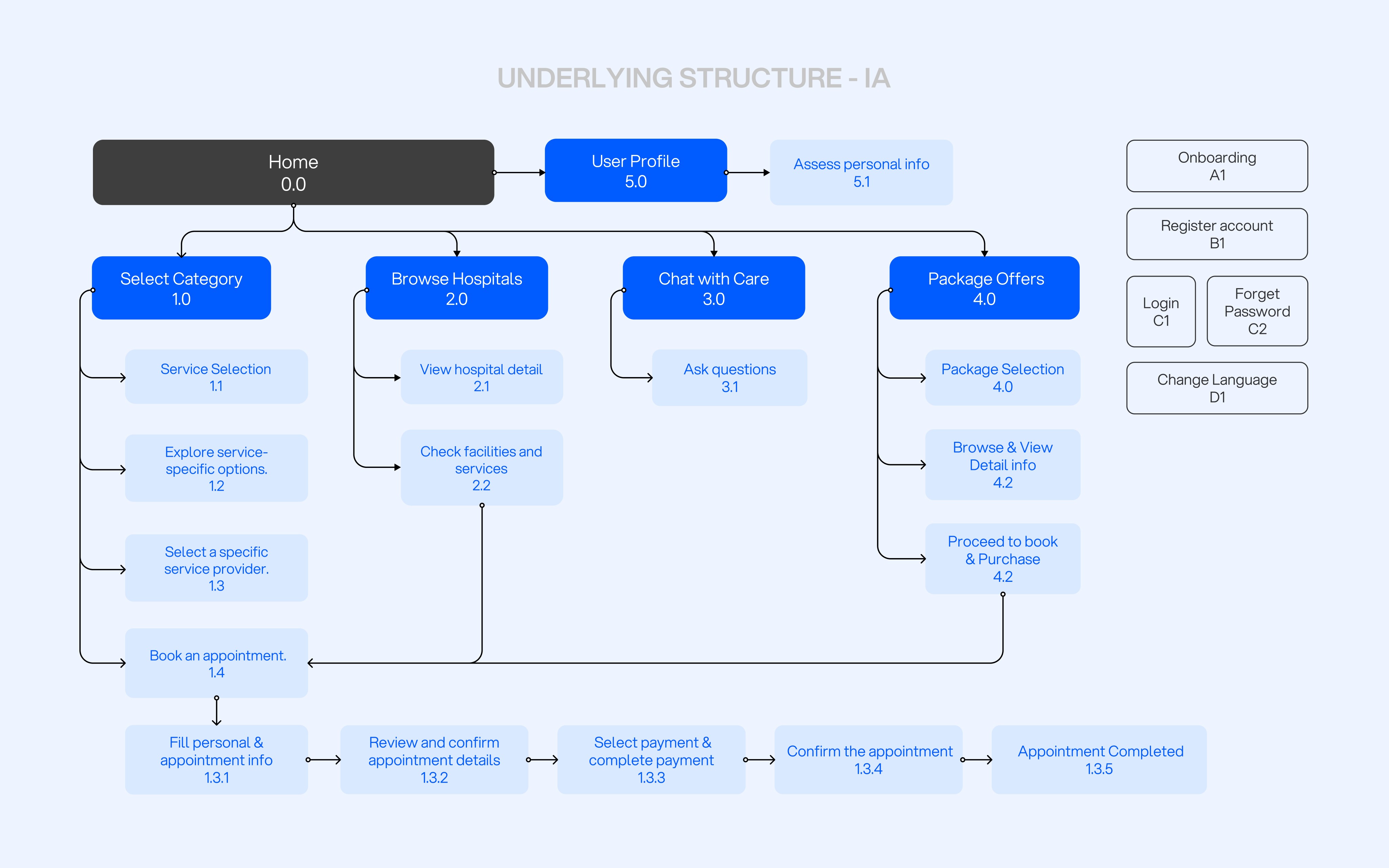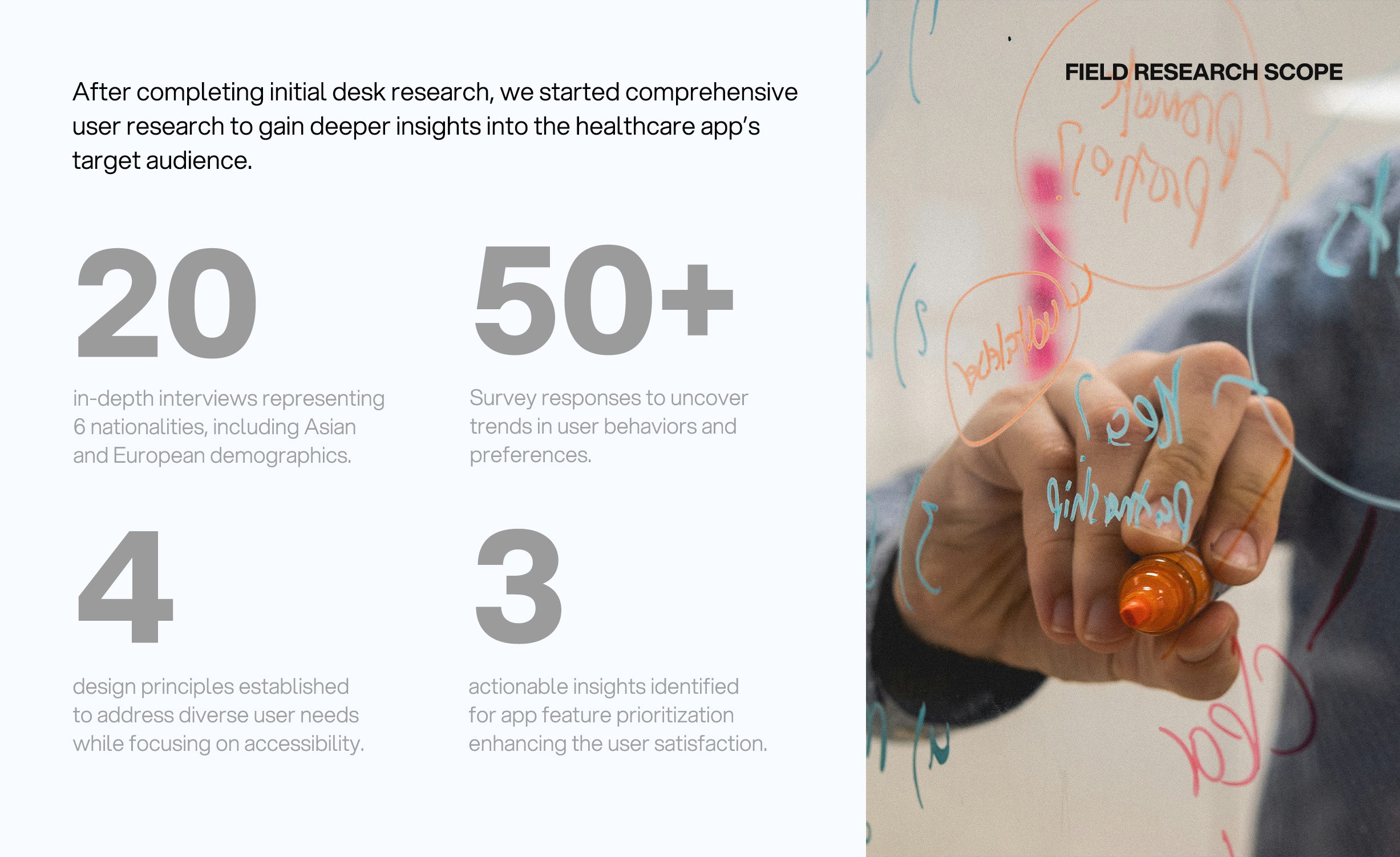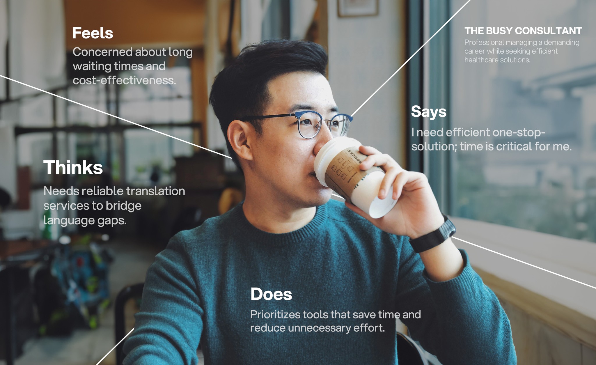 For Research & Insights, we started with desk research and deep user research. We conducted interviews with around 20 foreigners and analyzed existing healthcare apps, diving into what users were saying about their experiences. A recurring theme was the need for clarity and guidance. People didn’t just want a list of hospitals—they wanted a reliable, intuitive way to navigate the healthcare system. They needed information they could trust and personalized support to help them confidently book appointments and receive care without confusion.