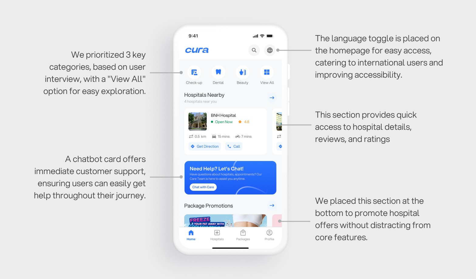 The turning point came when I realized that Cura needed to be more than just a healthcare app. It needed to be a companion for users, helping them through each step of their healthcare journey. This meant focusing on features that built trust and provided transparency like hospital reviews, language options, and seamless appointment booking.