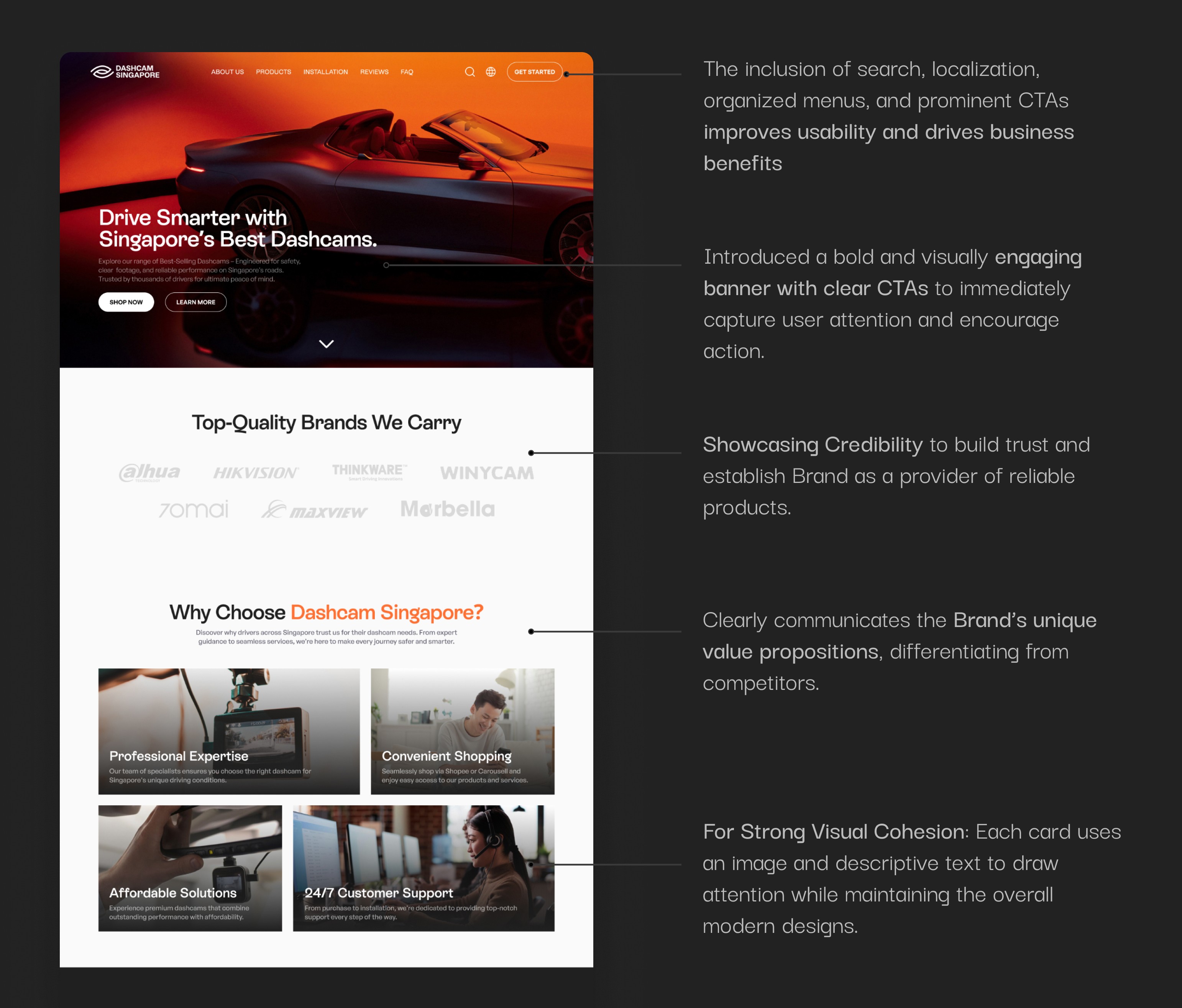 When trust and functionality collide, the result can either elevate or hinder a brand. Dashcam Singapore faced this reality: a website that struggled to convert curious visitors into loyal customers. I saw an opportunity to redesign the platform into something more than a website that seamlessly mixed usability with credibility, creating a trustworthy, user-first experience that could redefine the brand’s digital identity.