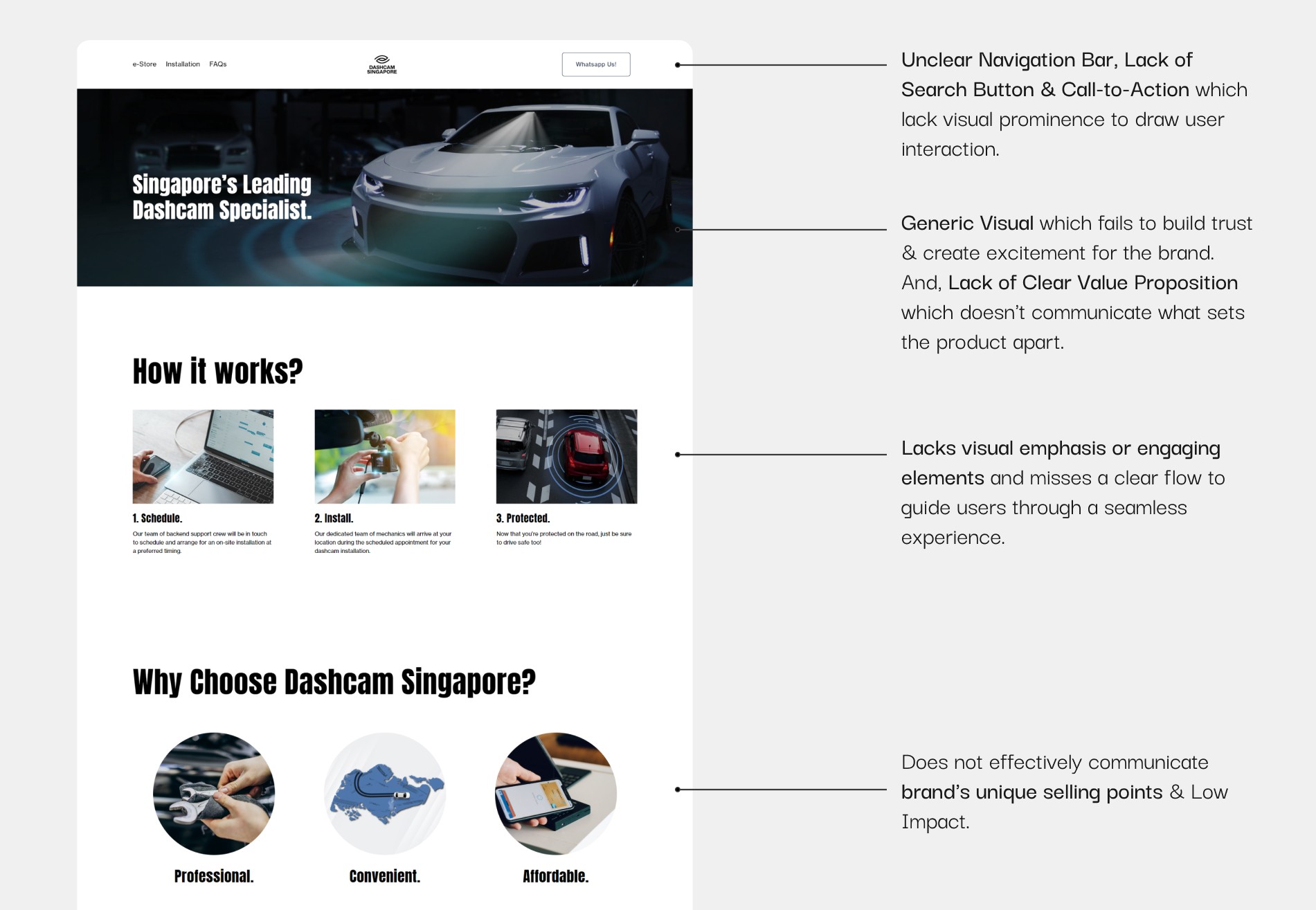 Dashcam Singapore's website faced challenges in converting visitors into customers and building trust with its audience. The reliance on external platforms like Shopee and Carousell for sales created a disjointed user journey, which impacted overall customer experience and retention. The website itself suffered from unclear navigation, poorly positioned CTAs, and a mobile-unfriendly design. Recognizing its critical role in the sales funnel, I took on the redesign challenge to create a site that would not only boost conversions but also establish Dashcam Singapore as a reliable and innovative brand.